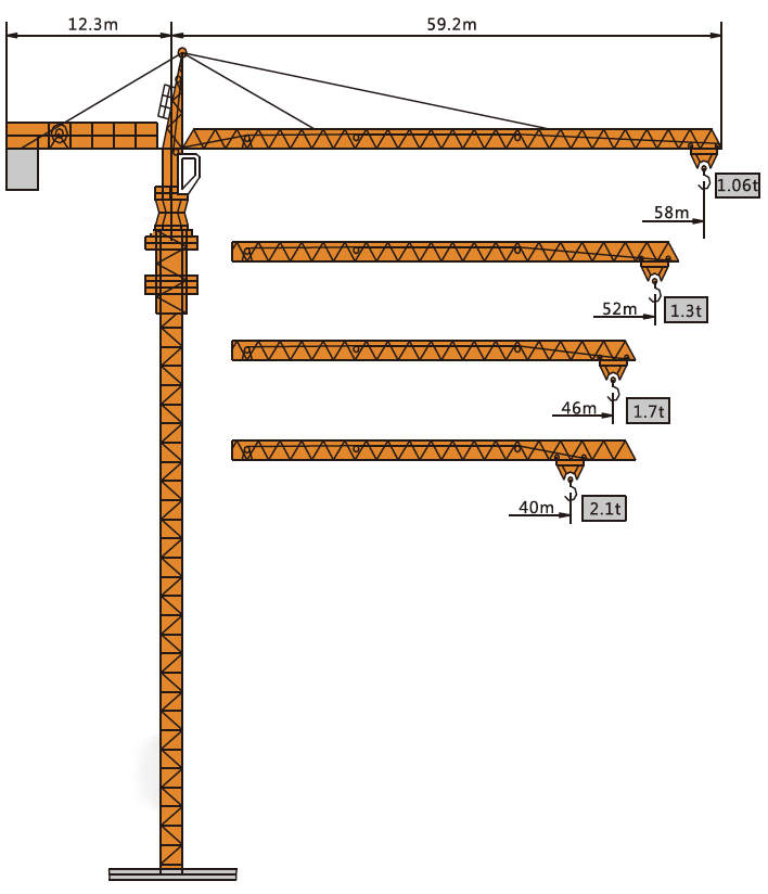 鸿达集团在成熟可靠的QTZ5810塔机基础上开发1.6m*2.8m标节QTZ80C(5810)塔机┃,其特点为:58米臂长|,臂端吊重1.06吨‖,最大起重量6吨,独立高度40.5米|,最大高度161米〓,起重臂变臂有58M、52M、46M┃、40M四种┃。起升机构采用三速电机驱动,回转机构采用液偶调速┃,变幅机构采用双速电机驱动┃。基础采用预埋螺栓┃、支腿或井字梁等连接方式┃,方便用户安装。