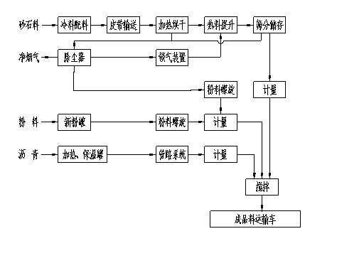 The whole machine includes main functional systems such as cold material proportioning and transportation, heating and drying, asphalt supply, powder supply, metering and mixing, exhaust and dust removal, and its process flow principle is shown in Figure 1-1: