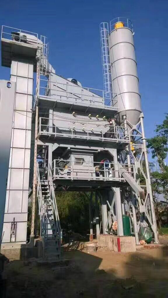 搅拌楼由热骨料提升机、热骨料筛分机、热骨料储仓、计量搅拌总成、及支腿等组成。其中热骨料提升机为垂直斗式提升;热骨料筛分为单轴电机驱动的三层半筛结构;热骨料储仓则按骨料大小分成四个仓,分别由微机控制其出料量;计量方式采用美国传力压式传感器称重计量,沥青由泵强制喷洒,搅拌器为双轴卧式搅拌结构。